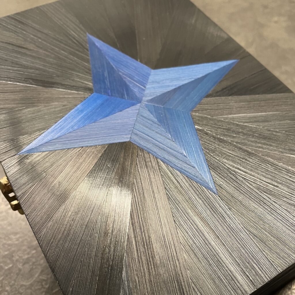 Un polissage délicat vient ensuite révéler toute la beauté de la marqueterie, en exaltant ses reflets dorés en faisant naître de subtils jeux de lumière aux nuances irisées.